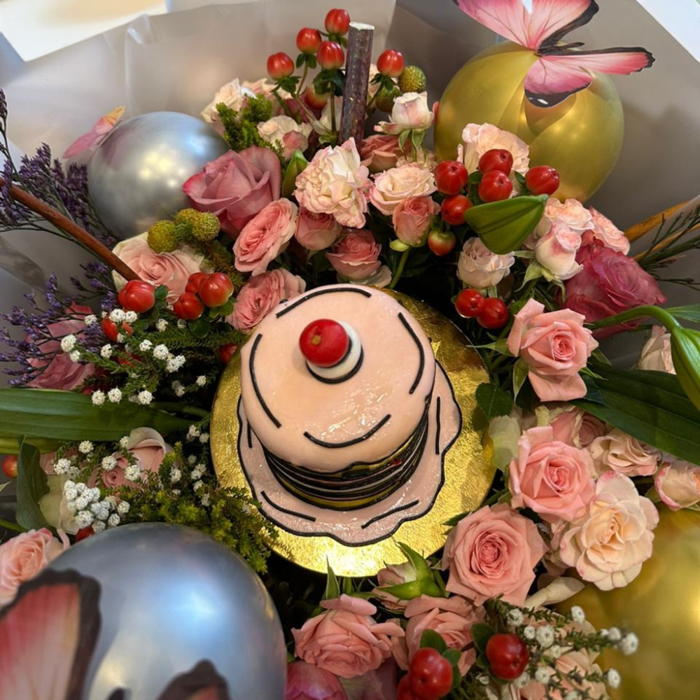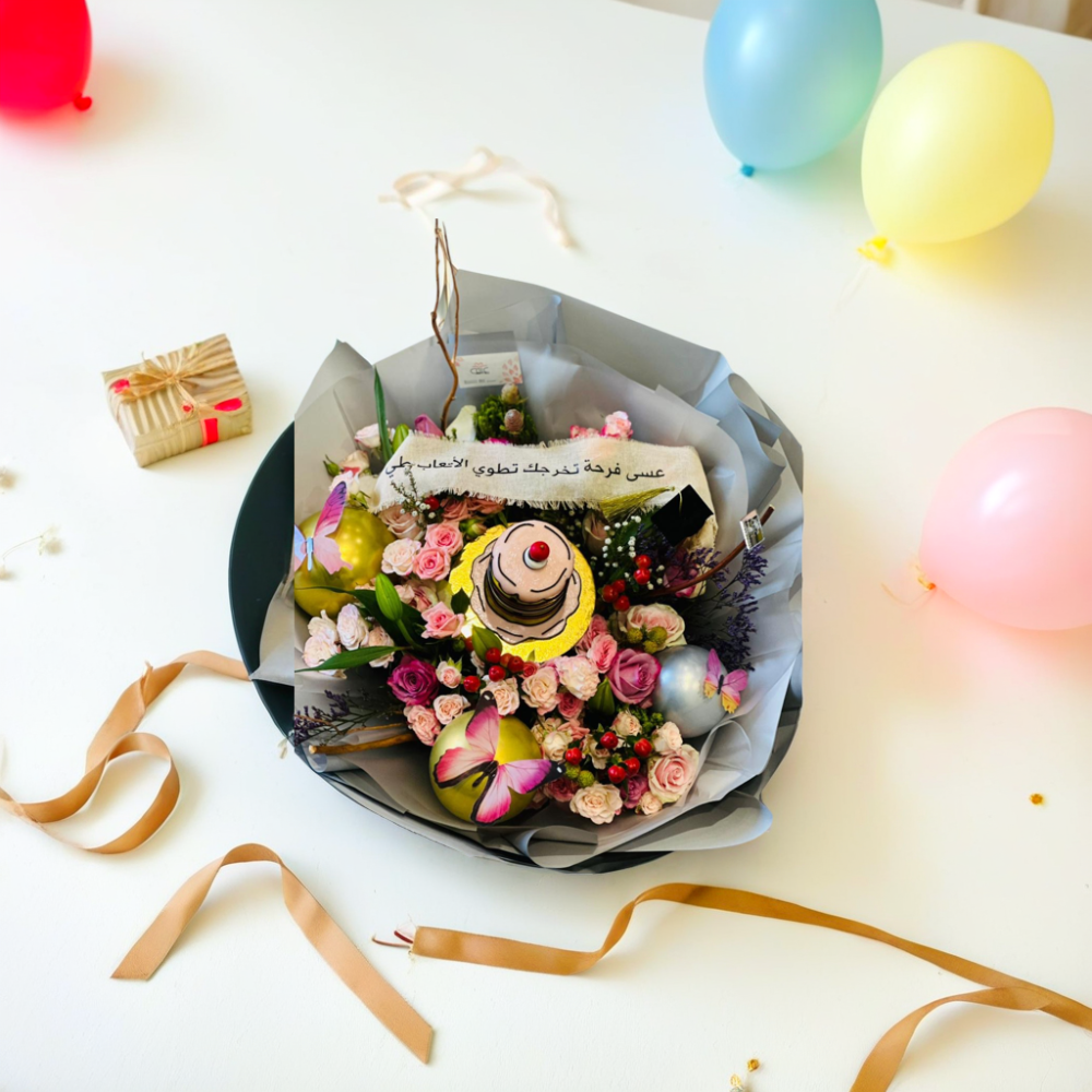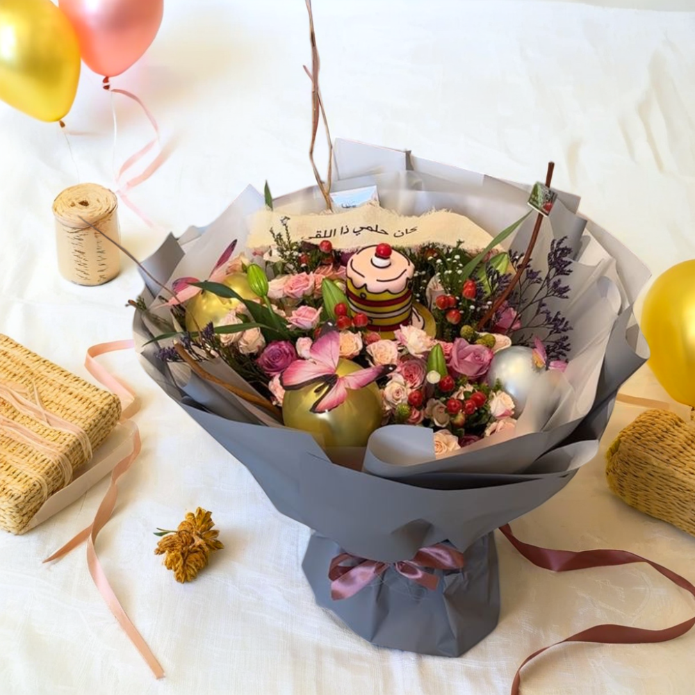 باقة ساحرة تجمع بين الزهور الطبيعية المنسقة بعناية والديكورات الإبداعية المميزة، مزينة بلمسات احتفالية تشمل كيك وعناصر زخرفية مثل الفراشات والبالونات الذهبية التي تضفي أجواء الفرح والاحتفاء على أي مناسبة.